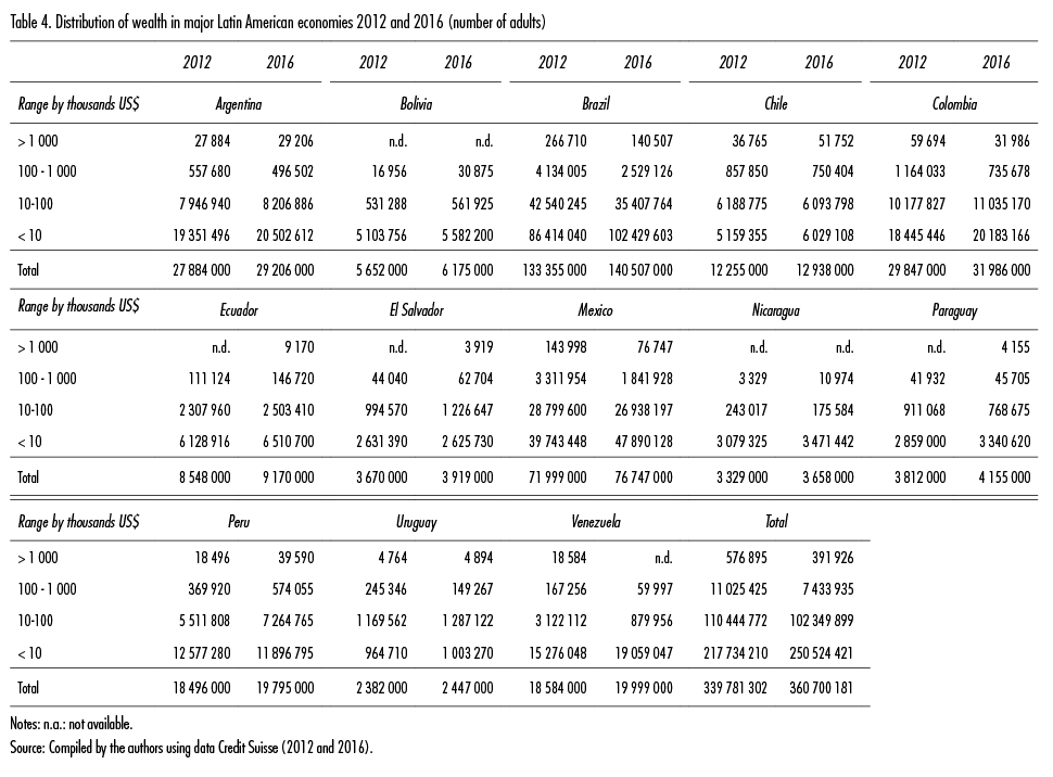 Table 8 shows wealth concentration in the main Latin American economies. It also shows the Gini coefficient calculated by Credit Suisse for each particular economy. The regional Gini coefficient, meanwhile, is recalculated according to a weighted average of the purchasing power parity GDP for the period 210-2016, in constant US$ based on 2011 values as reported by the World Bank. In the case of Venezuela, the years 2015 and 2016 were adjusted for the drop in real output in 2015 and 2016, as reported by the International Monetary Fund (IMF).